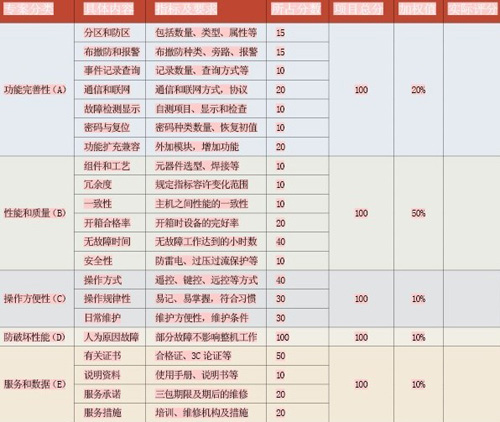 為了量化報(bào)警主機(jī)的適用情況,在進(jìn)行選擇和比較時(shí),建議采用評(píng)分制(表1)。但這種評(píng)分與簡(jiǎn)單的得分相加又不盡相同。以上所提到的五個(gè)方面,任何一個(gè)方面如果存在較大的問題,對(duì)主機(jī)整體都會(huì)產(chǎn)生很大的影響,就如擁有“一票否決”的性質(zhì)。且每個(gè)方面在總分中所占的比重,由加權(quán)值來調(diào)整。筆者建議,在實(shí)際中采用以下的列表評(píng)分法。至于每項(xiàng)具體得分,在總分中應(yīng)占多大比例,會(huì)隨各人掌握標(biāo)準(zhǔn)的差異,而有所不同,這里只是提供一個(gè)參考值。