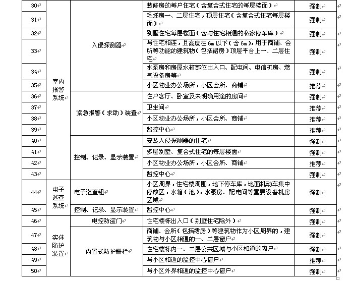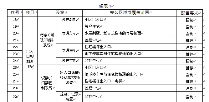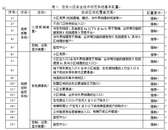 5.1.6 小區(qū)技防設(shè)施基本配置應(yīng)符合表1的規(guī)定。