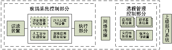 遠程管理控制部分應具有對前端采集控制部分所采集的數據進行分析、認證、分發(fā)、匯總、控制、管理等功能,應能直接與上級部門系統(tǒng)交互。在線狀態(tài)下,前端采集控制部分應能與網絡傳輸部分、遠程管理/控制部分等構成一個完整的系統(tǒng),實現遠程管理控制(如圖2所示)。